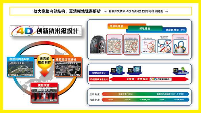 回顧鄧祿普的品牌發展歷程,技術創新是出現頻率最高的關鍵詞。鄧祿普技術團隊持續探索尖端科技,最新開發“4D創新納米級設計”技術運用大型放射光設備“Spring-8”、高強度質子加速器“J-PARC”和超級計算機“京”,從納米級微觀領域真實再現橡膠分子結構及運動形態,使原材料的開發精度和效率實現了質的飛躍,全面提升了輪胎產品的低油耗性能、抓地力性能和耐磨耗性能。